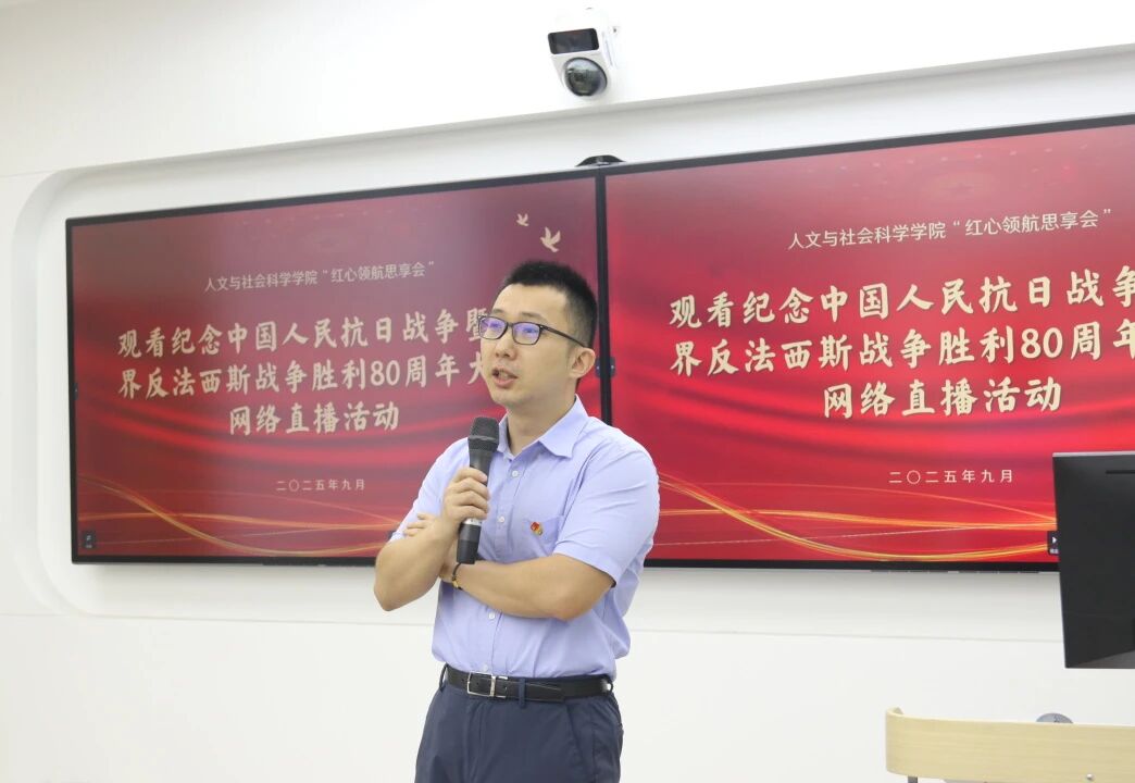 法律系副主任陈苏豪做了“纪念中国人民抗日战争暨世界反法西斯战争胜利80周年大会背后的历史意义与时代价值”的主题微党课。他表示,阅兵仪式不仅是对国防实力的展示,更是对那段浴血抗战历史的深情回望,是对民族精神的凝聚与彰显。自1945年抗战胜利以来,中国历经风雨、砥砺前行,每一次阅兵都是国家发展进程中的重要节点,此次纪念抗战胜利80周年阅兵不仅是对历史的致敬,更是中国现代化进程和国防力量飞跃的集中体现。希望同学们能够以此次活动为起点,将抗战精神内化于心、外化于行,在学术道路上深耕专业、锤炼本领,为民族复兴贡献青春力量。