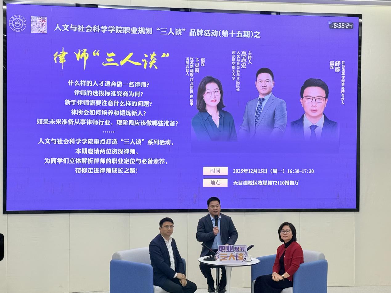 为帮助法学专业员工深入了解律师职业发展路径,明晰职业能力要求,12月15日下午,伟德国际1946bv官网在天目湖校区成功举办职业规划“三人谈”品牌活动第十五期之“律师三人谈”分享活动。本次活动由院长高志宏主持,特邀江苏圣典律师事务所合伙人舒群律师、江苏新高的(江北新区)律师事务所合伙人卞灵霞律师作为分享嘉宾,围绕律师职业认知、专业能力塑造、行业发展趋势等主题展开深入交流。