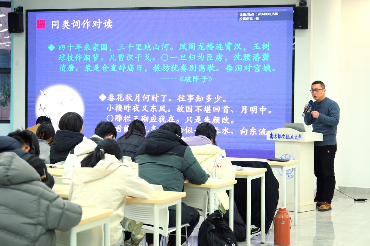 闵丰教授以“南唐后主李煜及其词作”为主题,围绕李煜的人生浮沉与词作风格演变展开系统阐释,将其个人命运的转折置于南唐兴衰的历史背景下进行深度剖析,清晰勾勒出个人际遇与家国历史的交织脉络。他通过解读李煜跌宕起伏的人生轨迹与千古流传的词作名篇,引导青年学子从古典文学中汲取精神养分,在历史镜鉴中厚植家国情怀、勇担时代使命,为在场师生带来了一场兼具深度与温度的文化盛宴。